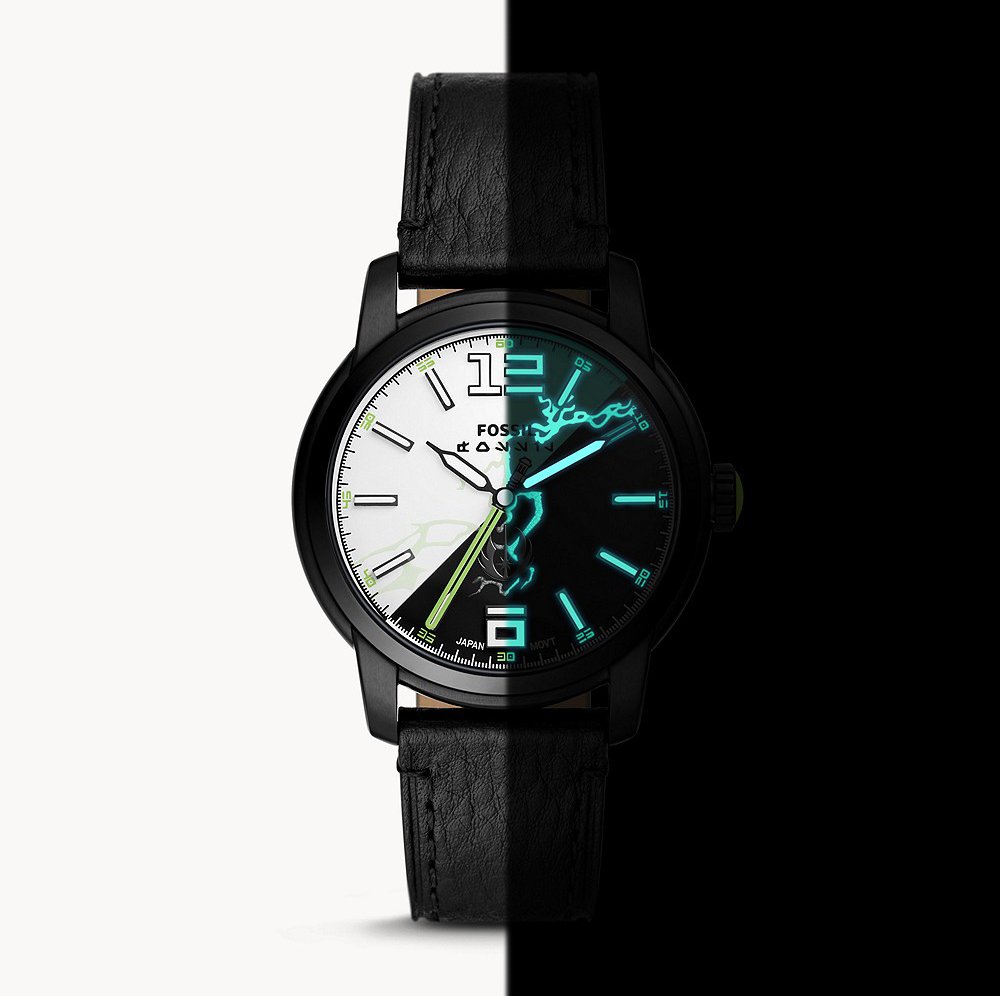The Luke Skywalker style draws directly from his all-black finale costume. The dial features a split black-and-white layout, echoing the concealed white lining of his jacket—a detail revealed only in the film’s climactic moment as he embraces the light and rejects the dark side. A green lightsaber second hand adds a precise fan-forward touch, while a hidden layer of transparent UV ink glows to mimic the Emperor’s Force lightning. The result is a quietly dramatic tribute to Luke’s defining transformation.